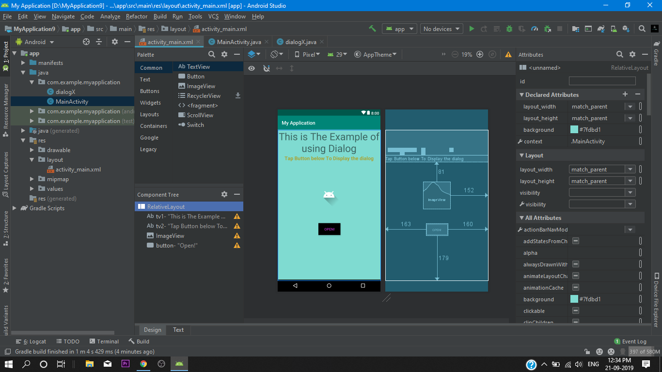 so first of all we set a button for the dialog box then we arrange all the widgets into our relative layout then we assign all widgets to there corresponding id’s.