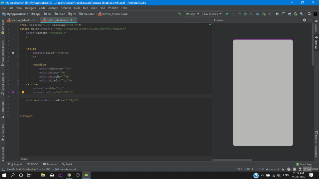 after completing our default_button.xml we copy all the codes for our two other .Xml file’s as i mentioned above so we go to our drawable folder again and create another resource file as button_disabled and we paste our code in it. then simply we change our color’s to gray as you can see below (for creating a disabled effect).