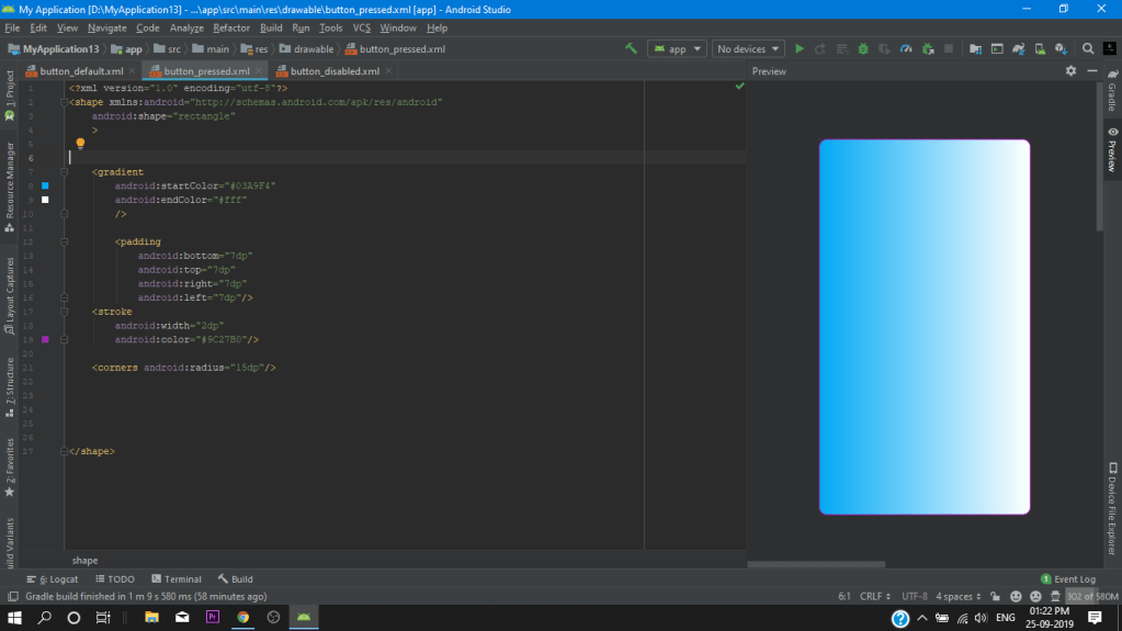 After that we create our 3rd resource file button_pressed.xml and again pase all code as we did earlier in the button_disabled.xml and just change the gradient color for a