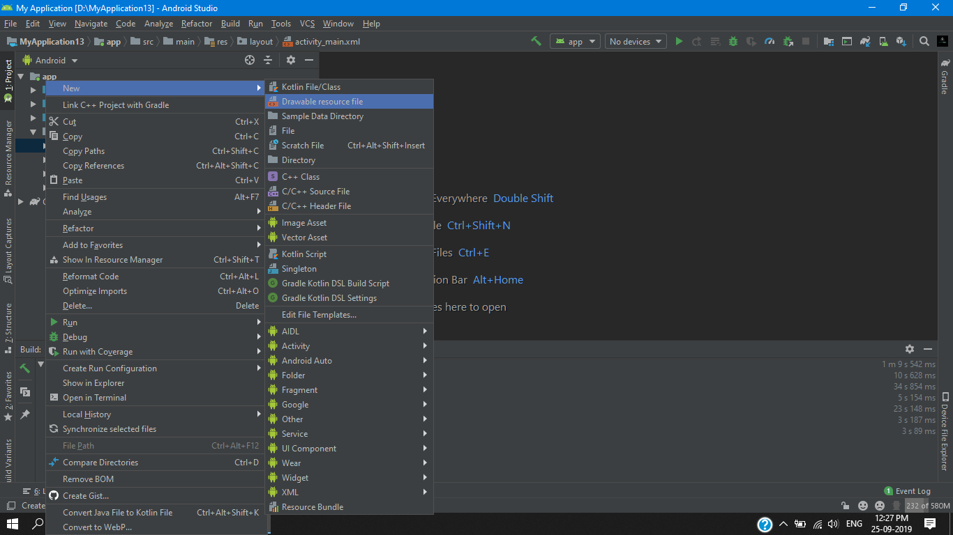 we need to create a new resource file so for that we will go intro res > drawable then we will right click on the drawable folder and pick a new resources file from the new section the first option on the popup menu. as you can see below.